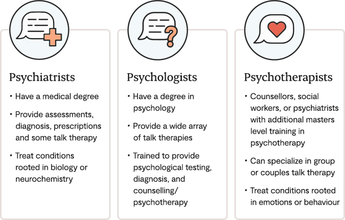 While there are key differences in the training and available treatments psychiatrists, psychotherapists and psychologists provide, there is often overlap in in the conditions they treat as there is no “one size fits all” solution to your mental health.